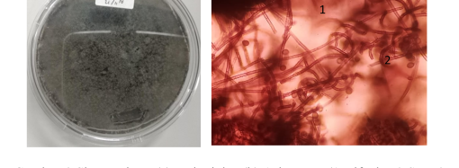 Nigrospora merupakan cendawan yang termasuk ke dalam kelas Deuteromycetes, cendawan ini merupakan agens hayati yang mampu menghasilkan antimikroba dan menginduksi ketahanan tanaman dari patogen. Pengamatan yang dilakukan terlihat Nigrospora memiliki koloni berwarna hitam, yang pada awalnya putih berubah menjadi hitam (Gambar 3). Pengamatan melalui mikroskop dengan perbesaran lensa 40×10 diperoleh bentuk kondia bulat berwarna hitam.